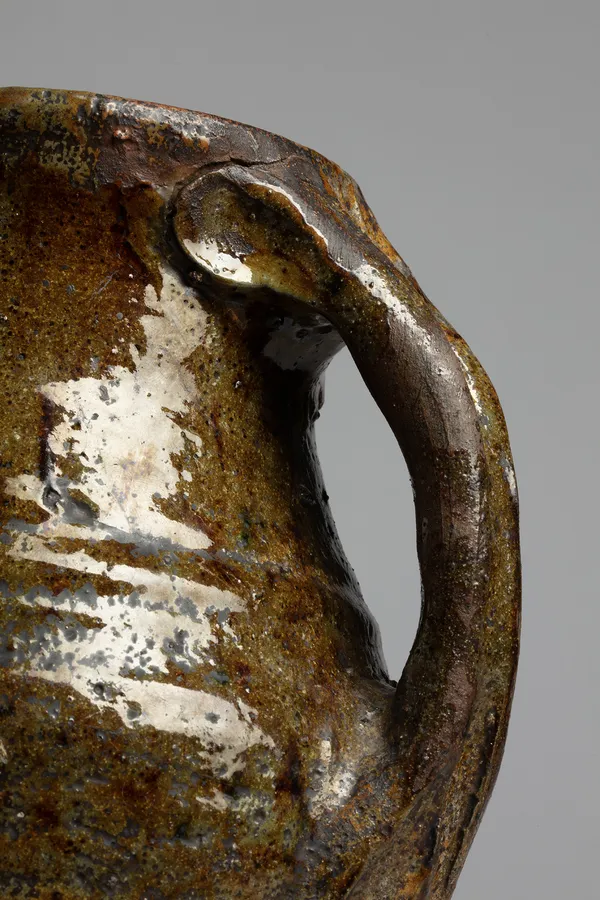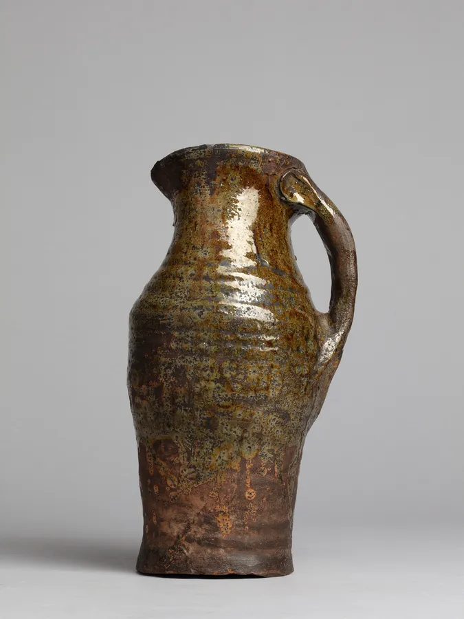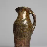 A slender Grimston ware-type jug with ornate thumbed handle