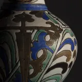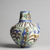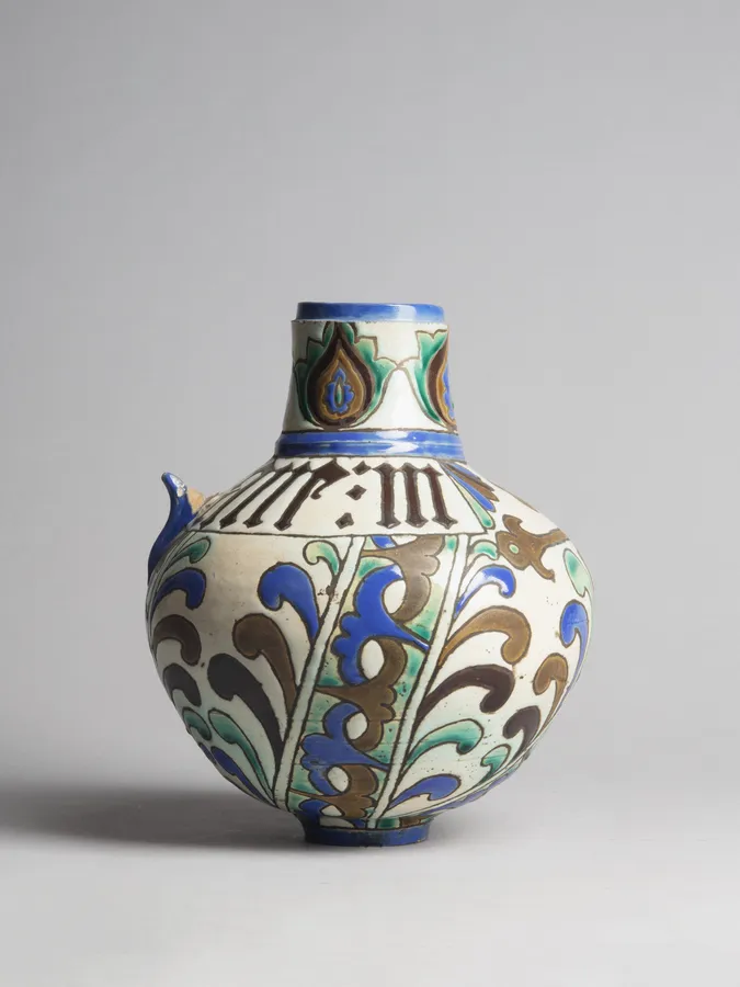 27 cm (height) x 22 cm (diameter); Tin glazed earthenware with yellow ochre, manganese, copper green, and cobalt blue decoration on a dark buff-coloured clay.
