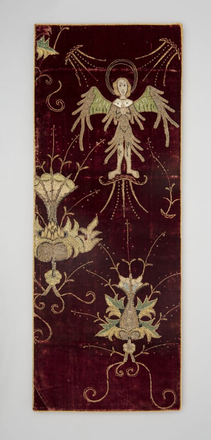 A panel of red velvet salvaged from a cope and embroidered with opus anglicanum