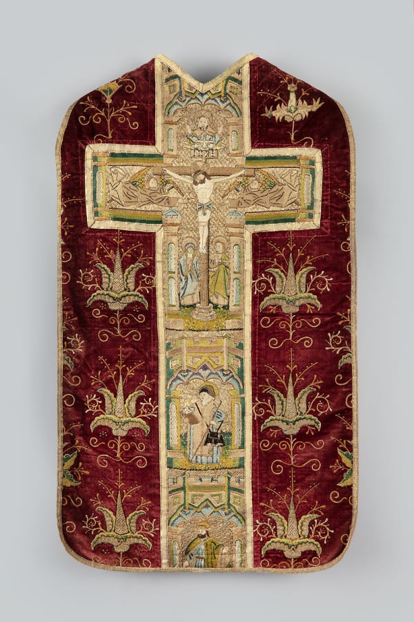 A red velvet chasuble with Opus Anglicanum embroideries showing the Crucifixion accompanied by saints