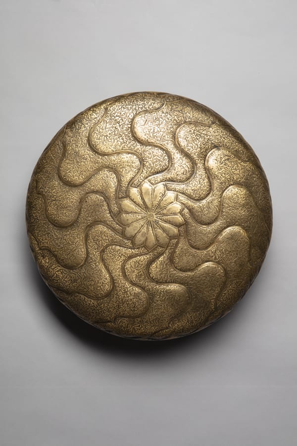 A large engraved brass basin with spiralled gadrooning around amiral blazons