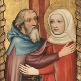 Saint Anna, the mother of the Virgin Mary, first appears in an apocryphal gospel called the Protevangelium of Saint James, written in the middle of the 2nd century CE. However, it was not until the 12th century that the cult of Saint Anna grew in Northern Europe.1 It was at this time that questions surrounding the conception of the Virgin Mary started to inhabit the minds of medieval theologians, who could not reconcile the purity of the Virgin with the original sin that may have accompanied Mary’s birth.The focal point of Anna’s story in art thus became the miraculous conception of the Virgin Mary after Anna‘s inability to have children with Joachim for twenty years. This event was represented in art with the embrace between Anna and Joachim at the Golden Gate, after they were both told by an angel that Anna will become preganant with Mary.