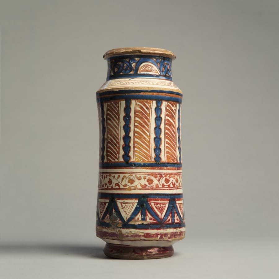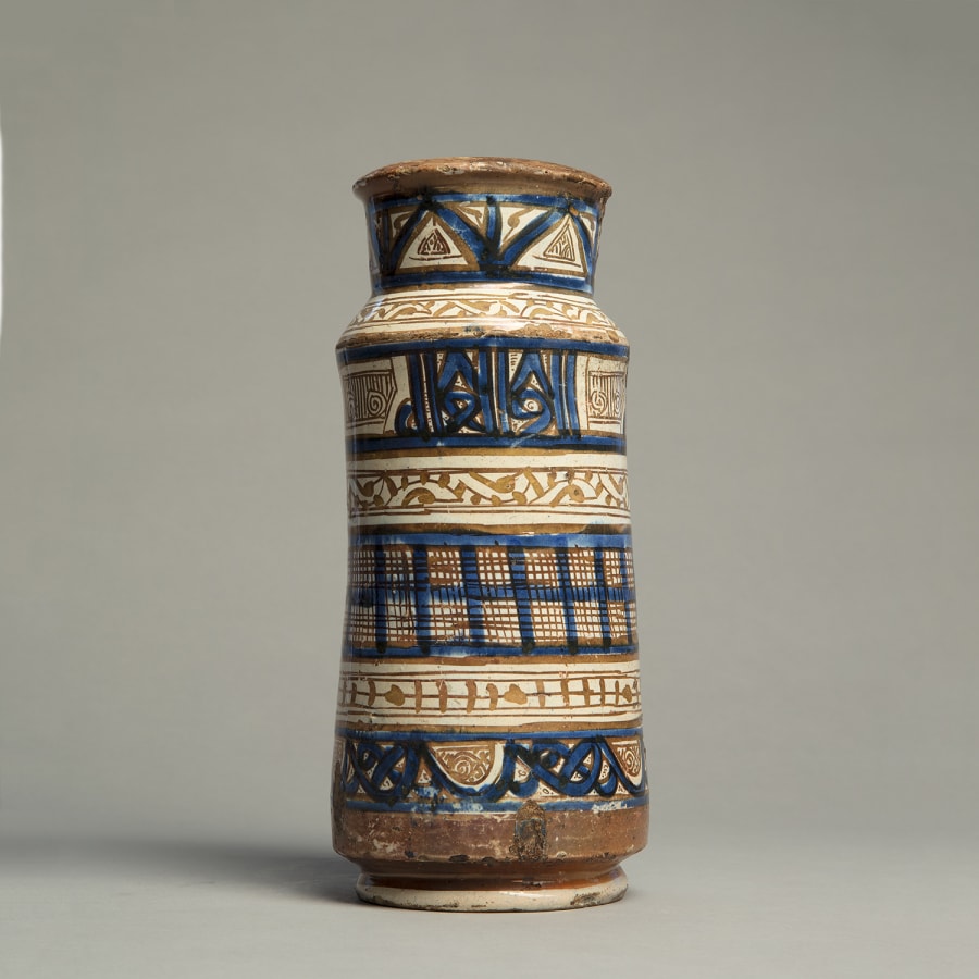 Two slender albarelli decorated with trelliswork, tendrils, and pseudo-Kufic motifs