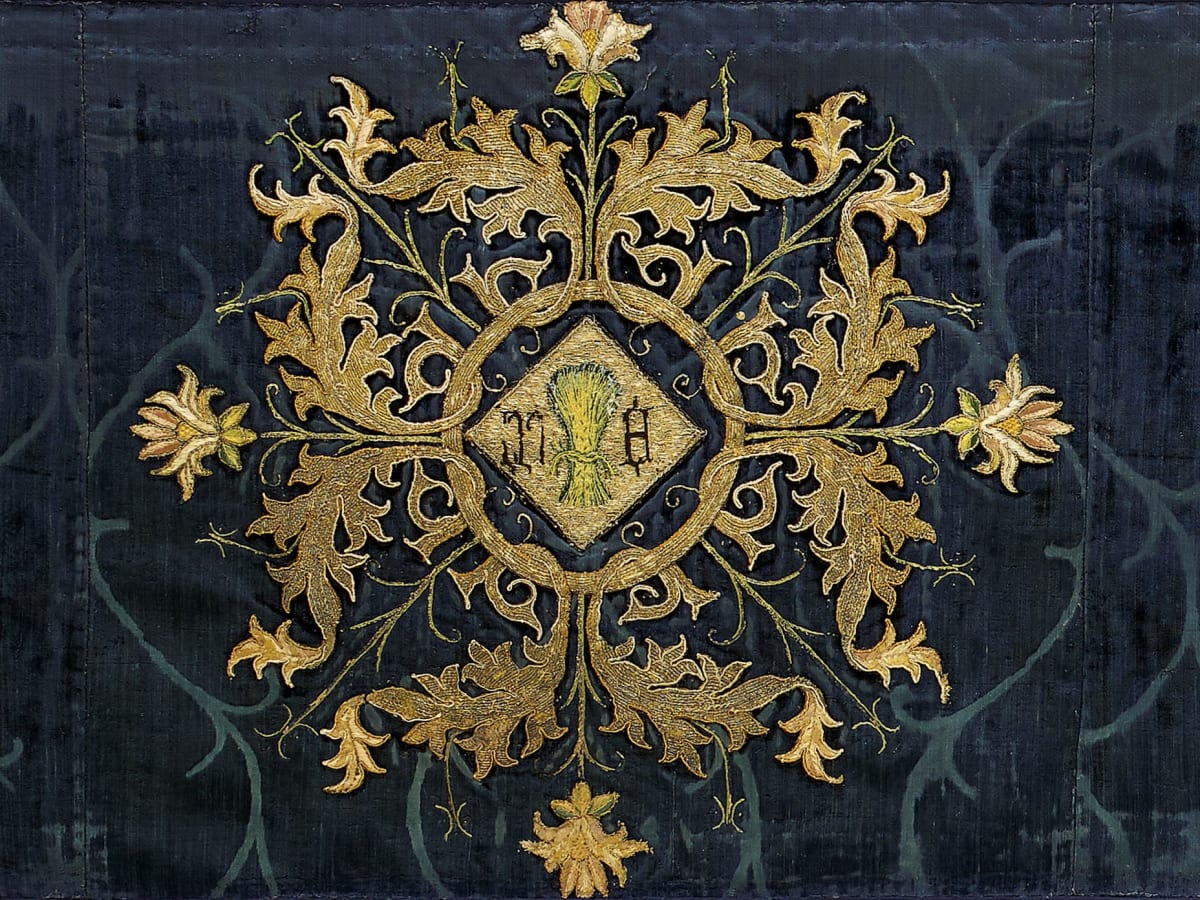 Embroidered velvet altar frontal with the Virgin and Child and two heraldic panels