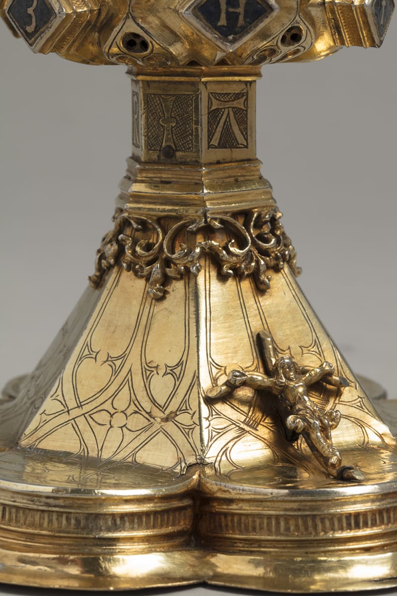 Some of these objects would have enjoyed daily use as part of the celebration of Mass: gold and silver chalices for administering the Holy Communion, cast bronze censers for the burning of incense, gilded crosses for carrying in processions or venerating at the altar. But many are so sumptuous that they would have been carefully protected in treasuries for much of their lives and only brought out at particularly significant moments in the year, such as high feast days or even royal visits. Materials were lavished on the most spectacular and refined of them, like gilded reliquaries whose surfaces are enveloped in vivid coloured enamels and have tooled designs worked into the surrounding metal. Others are covered in delicate filigree, micro-architectural structures, or small-scale cast figures of the saints and angels.