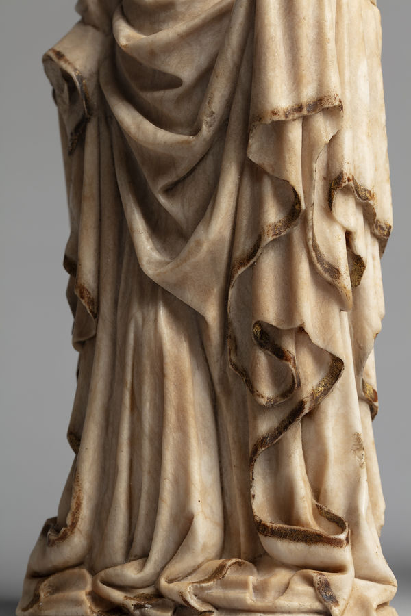 Both figures are carved from the same cream-coloured alabaster with pale veining and inclusions