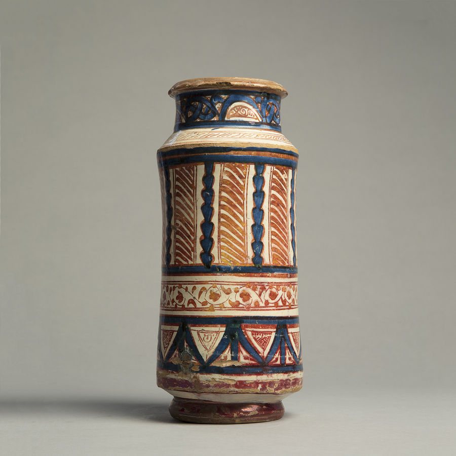 A slender albarello decorated with trelliswork, tendrils, and pseudo-Kufic motifs