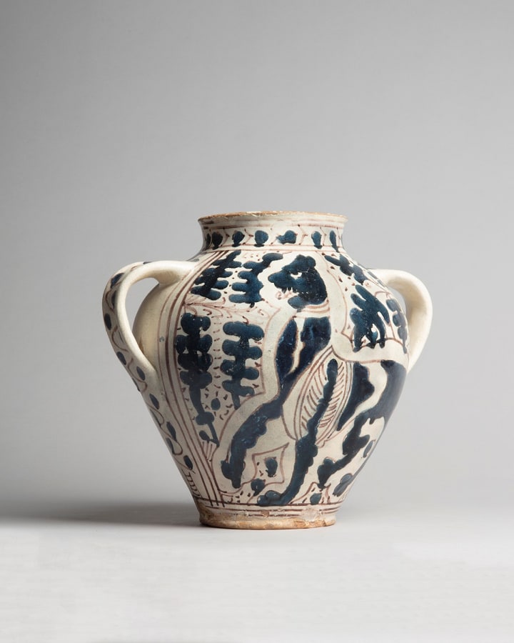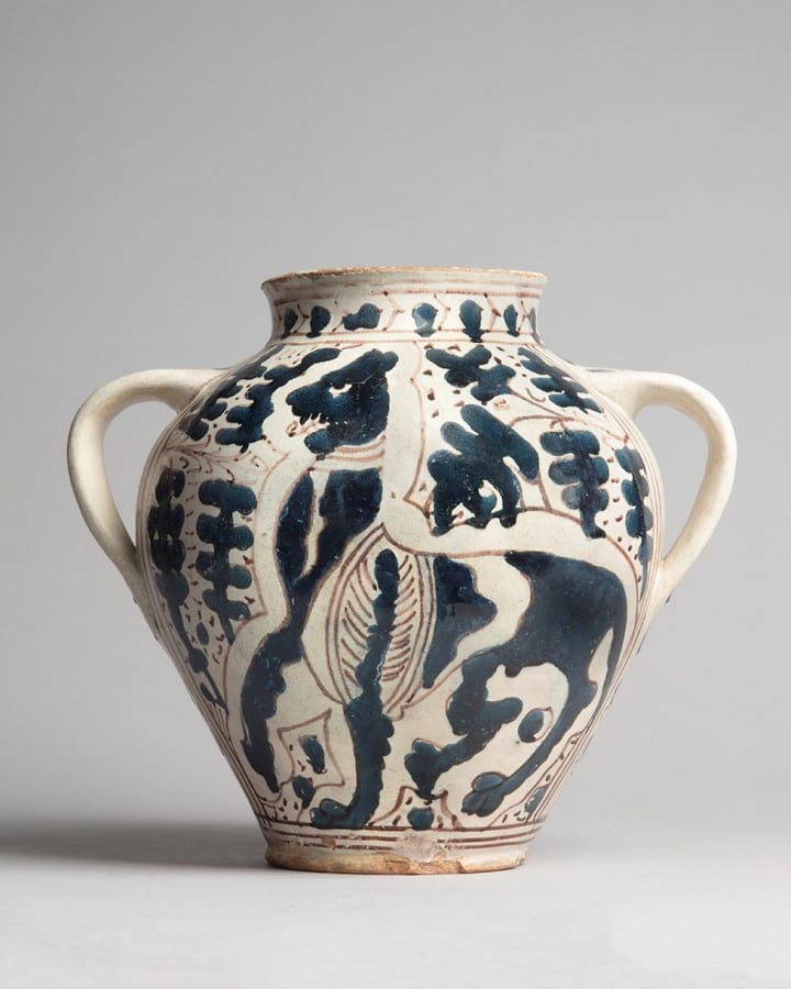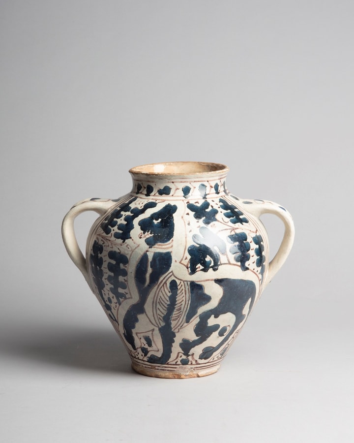Large relief-blue storage or pharmacy jar with leopards