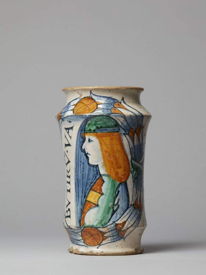 An albarello for storing butter, with a member of the Baglioni household shown at bust length