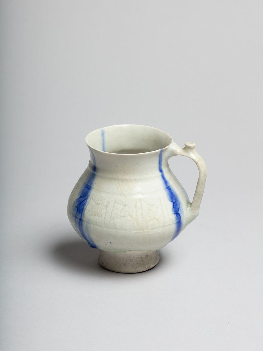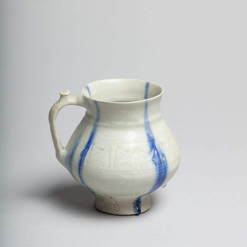 The exhibition opens with a fine 'silhouette-ware' jug (right) painted with a thick black engobe slip under a bright, transparent turquoise glaze. This early and powerful example of an underglaze-painted ware marks an important transitional moment in the history of Iranian ceramic production, from the use of slip-painting to the new underglaze-painting technique. The majority of the exhibition focusses on a group of underglaze-painted pots and jugs made in and around Kashan c.1180-1220. A small and remarkably intact water jug decorated with pigment-laden strokes of cobalt blue and incised decoration (below) illustrates the Kashan workshops' attempts to emulate the translucent and decorative effects of Song Dynasty porcelain using a Persian jug form. Other pieces, like an enameled over-glaze painted mina’i plate, reflect the technical and aesthetic achievements unique to the Kashan potters.