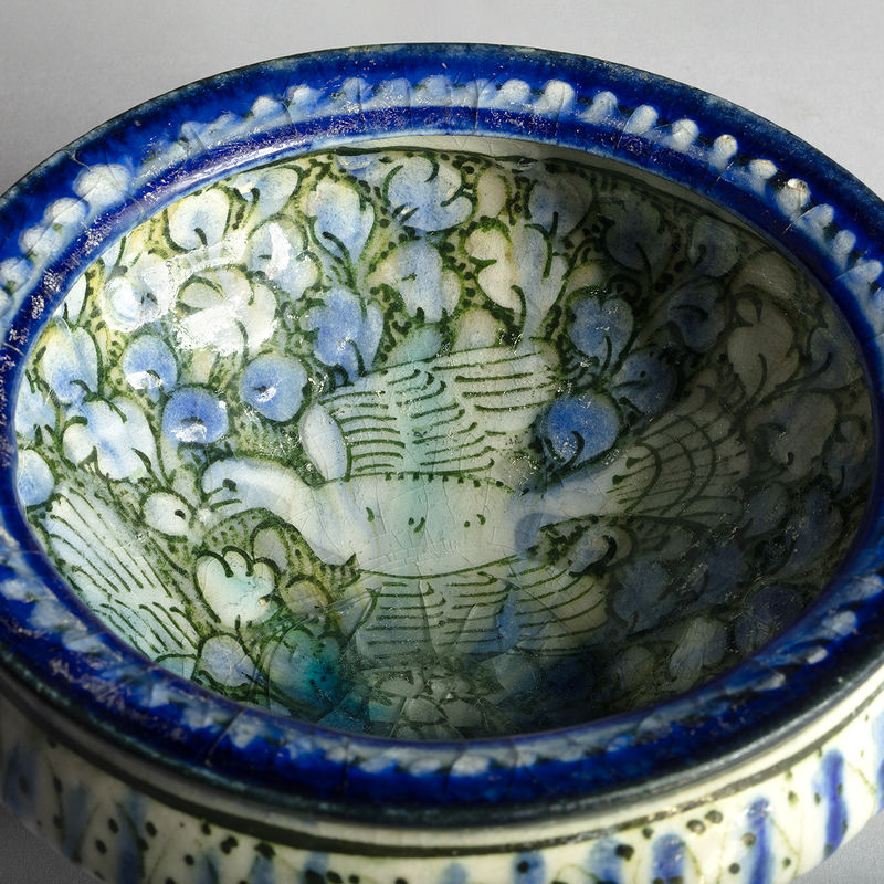 'Cobalt and Turquoise' is a focus exhibition exploring the use of blue pigments and glazes in the production of fine stone-paste ceramics in the Kashan workshops during the period between c. 1150-1350. The twelve objects presented here reflect the diverse production of medieval Persian ceramics workshops and their vibrant experimentation with blue glaze and underglaze-painting combinations.