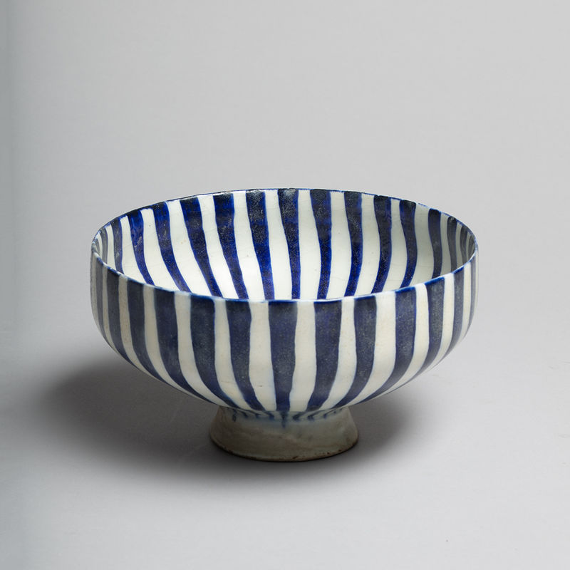 The fine, curving body of the bowl is enhanced by the rich blue strokes of pigment that trace over its form. The ability to form thin, high walls like this is a technical accomplishment made possible through the use of a durable stone-paste ceramic body. Raised on a short, unglazed foot, this simple vessel has a timeless elegance that emphasizes the union of geometry with form.